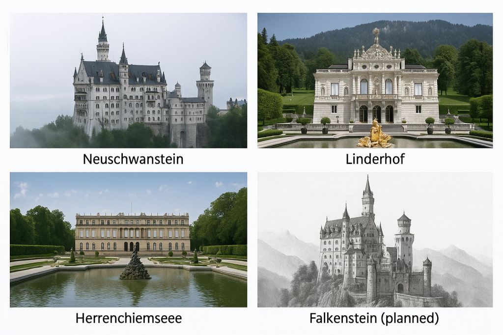 Castle photos adapted from public domain and historical archives, including Neuschwanstein, Linderhof, and Herrenchiemsee.